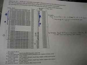 - Transformations done with 1uL of 0.1 ng/uL DNA (pGA 3K3 RFP from Rob Egbert). 0.1 ng is ~10^8 plasmid copies. Tami's electrocomp cells yielded several hundred colonies, which suggests the transformation efficiency is on the order of 100/10^8 = 0.000001 = 0.0001% efficiency. The chemically competent cells yielded < 10 colonies, which is much lower efficiency.