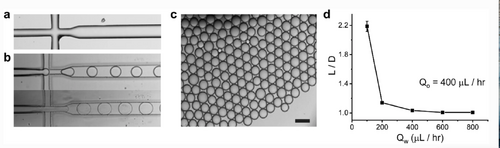 Gelatin is a hydrogel, which can give the microfluidic device hydrophilic surfaces that allow it to fabricate uniform microparticles [6]. Using riboflavin as the crosslinking agent to improve the mechanical and thermal stability of gelatin, it is possible to create a stable microfluidic device with feature size smaller than 100 µm to synthesize oil-in-water droplets and oil-in-oil-in-water double emulsions [6]. The droplets can be varied in size and shape by adjusting the flow rate ratios of the water-to-oil phases. [6] Oil-in-water microfluidic droplets can be used as templates to engineer monodisperse organophilic microparticles, while oil-in-oil-in-water double emulsions can be used as templates, monodisperse hollow or asymetric particles to release organophilic reagents in hydrophobic drug delivery systems [6].