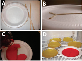 Jell-O powder is dissolved in water by heating up the solution. Wooden stirrers are attached to the foam plate using double sided tape to create the patterns of the device. Cooking spray can be used to coat the inside rim of the plate to make it easier to peel the jello after curing. The gelatin solution is poured onto the mold and allowed to solidify at 4°C. After curing, the Jell-O devices can be peeled off and placed on aluminum pans. Inlet and outlet holes can be punctured using a drinking straw to inject the fluid into the channels [2]. These Jell-O chips can be used as simple, fast and inexpensive teaching tools to demonstrate the microfluidics principles in education [2].