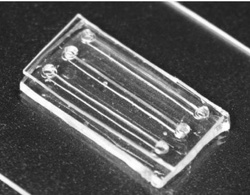 Enzymatically crosslinked gelatin microfluidic devices for cell culture can be created using a poly(dimethyl siloxane) (PDMS) mold. Cells can be cultured in these devices to study the effects of soluble factors and extracellular matrix on cellular morphology [2]. To prepare the mold, a negative photoresist can be spin coated onto the silicon wafers and photomasks is used to produce the patterns on PDMS mold. PDMS can be cured on the master and removed to make a mold for gelatin solution [3]. Gelatin is dissolved in Dulbecco's Phosphate Buffered Saline (DPBS) by heating and 0.02% chloroform is added to the mixture for sterilization. A crosslinking agent, for example, microbial transglutaminase (mTG) can be added to the solution to crosslink gelatin. The resulting mixture is poured over the PDMS molds and allowed to incubate at 37°C for 5 hours [3]. The gels can be removed after cooling to 4°C and heat treated in DPBS at 65°C for 30 minutes to inactivate the enzyme and dialyze chloroform from the gels. A thin PDMS membrane can be placed over the top of the crosslinked gel microchannels to complete the device [3].