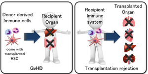 - GVHD functions similarly to immune rejection, but instead of the patient's immune mechanisms attacking a transplant, the transplanted tissue has carried some immune cells into the patient's body, which then treat it as if it is foreign.