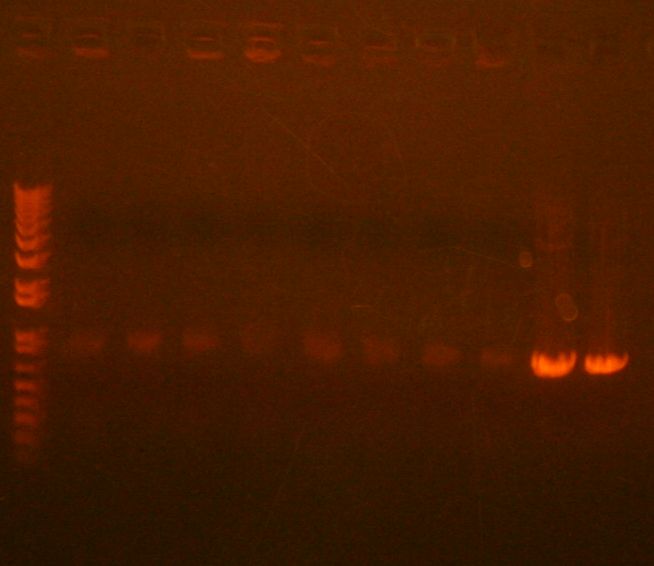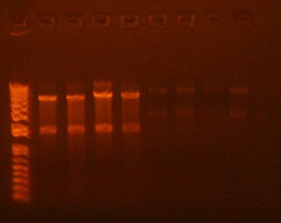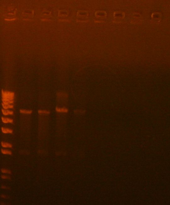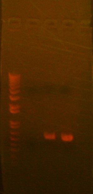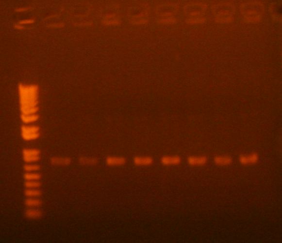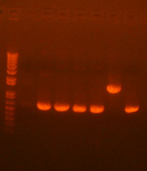 I designed an oligo that will add a XhoI site to the NLS. So if I do a PCR with ca998 and my oligo igemTen048, hopefully I should get a band around 733bp long. I should only get this band if NLS is after RFP. It can't PCR off just RFP, because there would be no NLS to bind to. And just NLS is only 33bp, so that wouldn't even show up on the gel. Ran a 2K55.