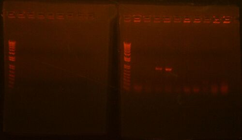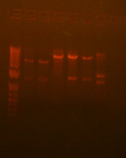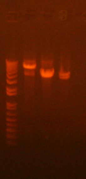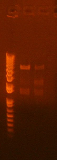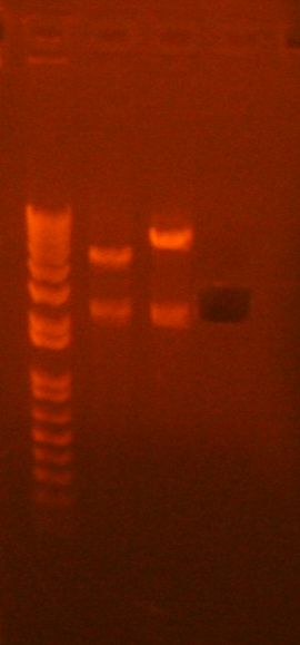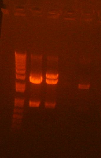 Even though I haven't gotten sequencing results back, I'm going to digest sample c and d with Bgl/XhoI. Digest started at 3:06pm. Gel purified. Expected lengths: 700bp dropout, vector should be ~5700bp. (Single cut would produce ~6400bp) Hopefully the gp worked well... I cut out the upper band, which was too high to really distinguish the length.