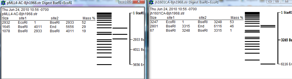 Desired lengths based off of part calculator sequences and the lengths of the digested pieces that would ultimately be included in the iGEM10_001 or 009 composite part after ligation and appropriate antibiotics selection.