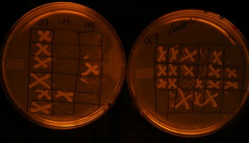 Today: Xed out green colonies, picked 8 colonies from A and B, inoculated them and plated on triple antibiotics to check for co-transformation.