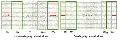 - The size (in ms) of each time step. This refers to how far the "sliding time window" moves with each iteration; in other words, whether you want the sequential time windows to overlap or not. If the time step size is equal to the time window size, sequential time windows will not overlap. If the time step size is half of the time window size, each time window will be offset from the previous one by half a time window. Having overlapped time windows results in a more accurate model but slower processing times. See the figure below for an illustration of this concept.