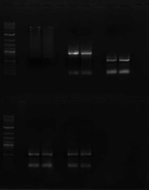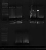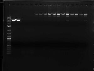 saved 1 ul (out of 100 ul PCR reaction) for gel analysis 1ul of PCR reaction compared next to 1ul of 1:40 dilution of original single-stranded library (lanes alternate)