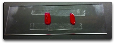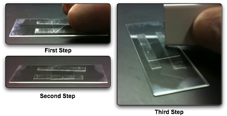 Attach a strip of double-stick tape to a glass slide (the tape and the slide should be parallel). Cut strips into the tape with a razor blade. Get a new glass slide. With curved forceps, carefully pull a strip of tape off the slide with tape and place it near the edge of the slide without tape (see image above for guide). If you pull straight up, the tape won't curl making it easier to lay on another slide. Do this with 3 more strips of tape. You want to leave spaces between the tape strips so you can flow material down each "channel". The middle channel will be used as a buffer so you may want to make the gap between the strips smaller. Again see image above as a guide. Once the tape is laid out, put a coverslide perpendicular to the slide on top of the tape. With the forceps, you can press on the slide where the tape is bound to make the seal better. Finally flow your samples and then seal the chamber with nail polish.
