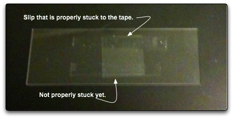 After trimming the excess tape, you will want to put a slip over the tape channel. Start by placing an edge of the the slip on the double stick tape and let it fall on the tape such that it the slip is somewhat squared up with respect to the slide. Once the slip is on the slide, use the box cutter to smash the slip on the tape.