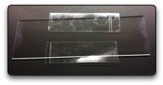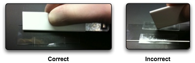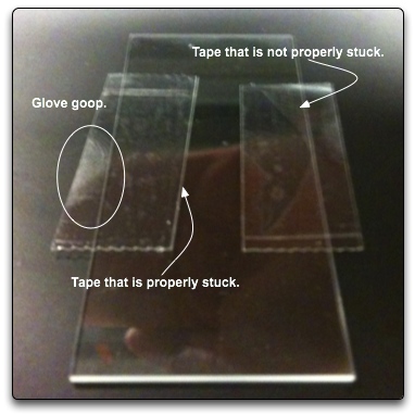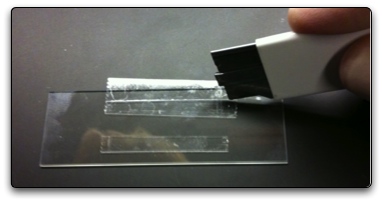 - Using curved forceps pull strips of tape off one slide and put them on another unused slide. Again the strips should be parallel to the slide.