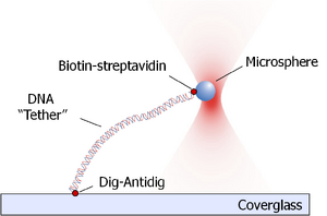 A very common method that is used is to label the DNA with digoxigenin (dig) on one end and biotin on the other end. The surface of the glass slide is coated with a polyclonal antibody against dig (anti-dig) and the microspheres are coated with streptavidin (which binds to biotin with high affinity). This makes the tethering scheme: