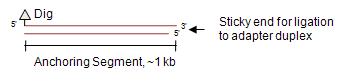There are many possible alternatives for preparing this piece. One would be to restriction digest a plasmid and ligate a dig-labeled hairpin or duplex onto one end. This would probably work very well, and allow for multiple-dig labels and / or a hairpin to increase the anchoring segment stability. We have not yet tried this as of 2007.