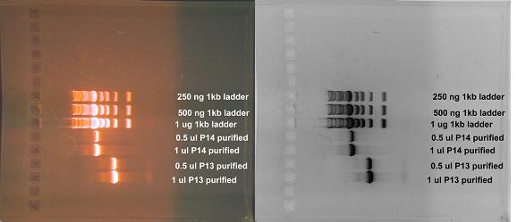 In order to completely remove the small fragment of the restriction digest, we used gel extraction. A gel similar to above was run, except 5 small lanes were taped together to fit the almost 50 microliters + loading buffer. The 25 ml (small, about 10 cm x 10 cm) gel was probably run at 90 V for about 30 minutes. Band is cut out with razor blade, and DNA extracted with QIAquick Gel Extraction kit.