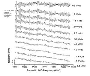 After aligning the optical tweezers (at Cornell, Wanglab, see Koch_Lab:Publications 2002 Biophys J article) Steve, Richard and others discovered that using our AOD to steer the optical trap in the sample plane produces huge "wiggles" on the detector. These wiggles could add as much as 10 nm of error into the detection signal, which was unacceptable. Steve studied the hell out of this for over a month and in the end, use of the AODs for other than intensity modulation was abandonded, and the piezo stage was used for 1-D stretching. Many unpublished things were discovered along the way, which could be useful to other optical tweezers labs or others using AODs. Some of our thoughts: