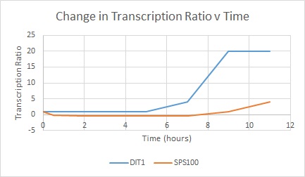 - Choose two genes from Figure 4.6b (PDF of figures on MyLMUConnect) and draw a graph to represent the change in transcription over time. You can either create your plot in Excel and put the image up on your wiki page or you can do it in hard copy and turn it in in class.