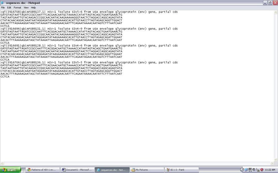 - I obtained the GenBank record online and saw difference sequences available to look at. I chose a random sequence available and save the sequence as a FASTA formatted sequence but opened the file using notepad