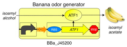 For the 2006 iGEMcompetition, MIT students designed eau d’ e coli, E. coli that smell like bananas when their population is in the stationary phase. They did this by inserting device that contains a stationary phase sensitive promoter coupled to a banana smell device, a device that contains a ribosome binding site (RBS), an open reading frame (ORF) that codes for the ATF1 enzyme and terminator sequences. The ATF1 enzyme converts isoamyl alcohol to isoamyl acetate, the molecule that gives bananas their characteristic smell.