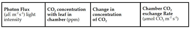 Draft a data table in your lab notebook to document the changing CO2 concentrations at different light intensities. Parameters should include Photon Flux, Reference CO2 Concentration, CO2 Concentration with Leaf in the Chamber (ppm), ΔCO2 concentration (ppm), and Chamber CO2 Exchange Rate (µmol CO2 m-2 s-1).