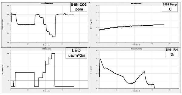 6. Turn on the LED and adjust its illumination output to about 800 µE m-2 s-1, unless otherwise instructed. On the computer screen you will see 4 graphs (Fig 5.1):  CO2 concentration (upper left), LED Irradiance (lower left),  Air  Temperature (upper right), and Relative Humidity (lower right).  Keep an eye on the irradiance and CO2 concentration.