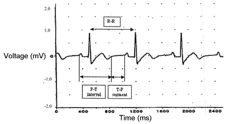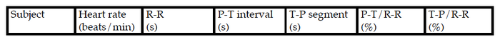 Draft a data table in your lab notebook in which you will record heart rate (beats/min), R-R (s), P-T interval (s), and T-P segment (s) for each individual tested, both at rest and immediately after exercise. You can also use this table to calculate the % of each total R-R represented by each subunit.