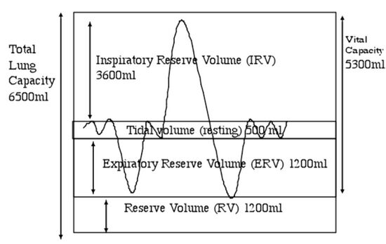 Fig. 8.5. Lung volumes in milliliters. The resting volume of air exchanged by the lungs is the tidal volume in and out of the average lung with each breath, the inspiratory reserve volume can be used in times of greater oxygen needs and represents the exchange you can force when you breath in very deeply and exhale with effort.