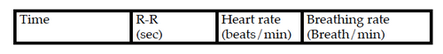 Draft a second data table in which you will record R-R (s), Heart Rate (beats/min) and Breathing Rate (breaths/min) for each individual for each of these time periods: before exercise, immediately after exercise, and 1, 2, 5, and 10 minutes after exercise.