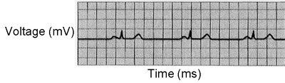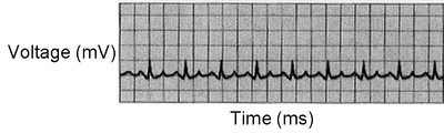 This ECG shows an accelerated heart rate of an athlete while performing rigorous exercise (136 beats/min)(Fig. 8.7B). Tachycardia can also be caused by taking stimulants, such as caffeine or nicotine, or by some physiologic factor, like hyperthyroidism.