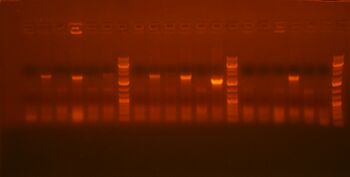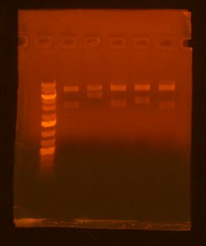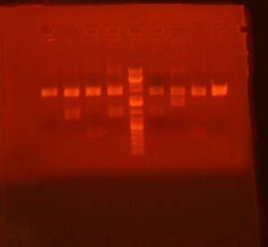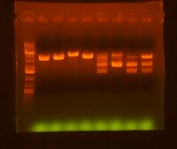 - Did another restriction map with less DNA (0.5uL), same expected band sizes: