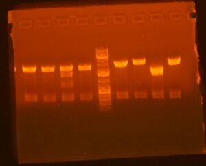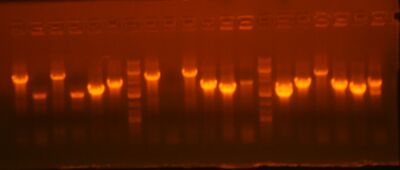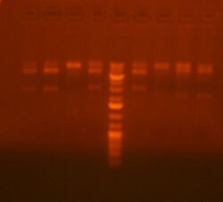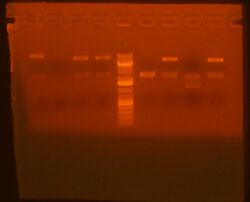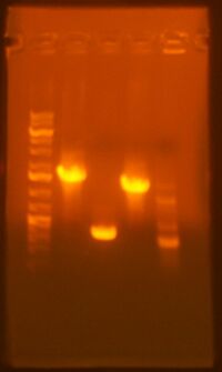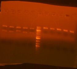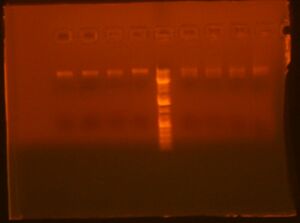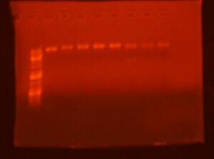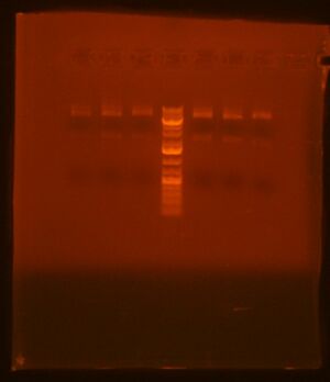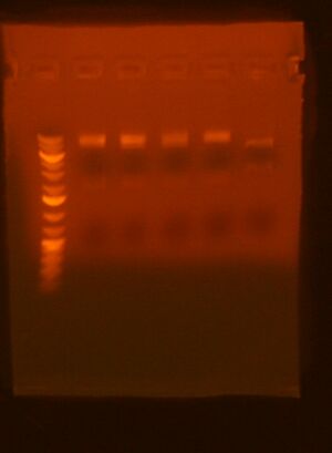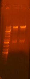 File:Gel92509.jpg everything looks good except needle scfv. I'm going to send them for sequencing because the assembly products were all bad and i'm not sure why. prehaps the backbone is messed up?
