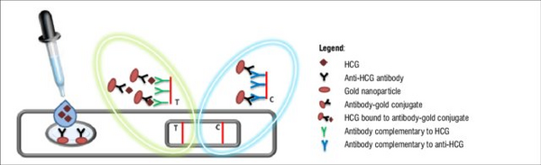 Lateral flow assay devices, specifically sandwich assays, are most commonly used for commercial pregnancy tests. Urine is placed in the sample introduction window and then on the sample pad, as shown in figure 5. When a woman is pregnant, the human chronic gonadotropin (HCG) hormone is present in the urine. Over-the-counter pregnancy tests simply work by detecting HCG, which is made at the beginning of pregnancy. The exposed end of the pregnancy test strip is where the urine is applied. Figure 5 shows that as the fluid travels up the strip, it crosses various separate zones. Antibodies grab onto any HCG as it travels up the strip, with the help of enzymes with the ability to turn on either dye molecules or gold particles. The antibodies used for pregnancy tests are different for each manufacture. Some use antibodies to detect nonnicked hCG and free-beta hCG, while others detect nicked and nonnicked hCG [8]. If HCG is in the urine, then it binds to an antibody attached to a gold particle and results in a positive pregnancy test as shown in figure 4 [3]. Figure 4 shows that when HCG is present in the urine, the result is a positive lateral flow assay pregnancy test. This then flows to meet another antibody that is also complimentary to HCG and results in the test stripe. As the urine continues to flow up the strip, the urine picks up all the AB-1 enzymes and carries them to the test zone of the strip. There are more Y shaped antibodies that will also stick to HCG during this process. The reason this form of lateral assay is called sandwich assay is because if HCG is present, then it gets sandwiched between the two different antibodies. The antibody conjugates that do not bind to HCG flow to a third antibody and results in the control stripe. A negative test happens when the control line appears alone, and a positive test happens when both the test and control line appear [9]. As shown in figure 5, HCG antibodies, gold nanoparticles, antibody gold conjugates, and antibodies complementary to both HCG and anti-HCG are included in these assays. These lateral flow assay devices are commercially available in most drug stores and pharmacies all over the country.