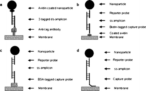Microfluidic devices such as nucleic acid lateral flow (immuno)assays can test for bacteria or pathogens within the environment. Here, the analyte of interest is a double stranded nucleic acid sequence specific to the organism using primers with two distinct tags. The analyte is recognized because it binds to a tag-specific antibody. When detecting pathogenic bacteria, the nucleic acid was amplified using two tagged primers. At the test line on the device, a solution was sprayed which contained antibodies raised against the tag. One of these tags will bind to specific nanoparticles, and the other tag will bind to the anti-tag antibody, which results in a colored signal. This response is proportional to how much analyte there is in the sample [3]. Figure 6 shows the nucleic acid formats that are possible when using these lateral assay test devices for bacteria and pathogen testing. These nucleic acid formats are available for environmental testing in commercially used kits. As shown in figure 6, there are many possible ways for nucleic acid lateral flow assays to be formatted, with mainly the differences in the detail at the test line. Part a of figure 6 shows the nucleic acid lateral flow assay with nanoparticle-labelled avidin used as reporter with two tagged primers [3]. In this format, biotin binds to avidin and the anti-FITC antibody bind to FITC. Part b of figure 6 is different because of the addition of a single-stranded amplicon (ss-amplicon) with various probes [3]. Part c of figure 6 has the addition of the BSA probe that is immobilized through passive adsorption [3]. Finally, part d of figure 6 shows the capture probe immobilized at the test time by ss-amplicon hybridizing with reporter and capture probes [3]. The importance of figure 6 is that it shows just some of the possible formats for nucleic acid lateral flow assays that test for the presence or absence of pathogens in the environment.