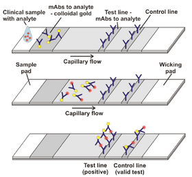 Direct assays, or sandwich assays, are used for larger molecular weight analytes with more than one antigenic sites. This format is normally used to detect larger analytes with at least two binding sites. Typically an antibody to one binding site is conjugated to the nanoparticle and the antibody to the other binding site is used for the assay's test line [7]. These sandwich assays are used to detect larger analytes that have two or more binding sites. An antibody is conjugated to the nanoparticle on one binding site, and another antibody to a different binding site is used for the test line. The analyte will bind to the antibody and the nanoparticle conjugate as well as to the antibody on the test line if the sample contains an analyte. In sandwich assays, the intensity of the signal at the test line is directly proportional to the quantity of analyte present [7]. This kind of test would not work for small molecular weight analytes, only for large molecular weight analytes. Direct assays consist of a label coated antibody, which is usually an enzyme, nanoparticle, or fluorescent dye [5]. The nanoparticles in these assays are a method of detection to simply give the results a visual color. Primary antibodies against target analytes are immobilized over the test line. At the control zone, a secondary antibody is immobilized against the conjugate antibody that is labeled. The sample with the analyte is applied to the application sample and then it migrates to the remaining sections of the strip. The target analyte is then caught by the immobilized antibody and finally the labeled antibody/analyte complex is formed. This labeled antibody/analyte duo then gets to a nitrocellulose membrane and then moves using capillary action [5]. The analyte then migrates in between the labeled antibody and the primary antibody in a sandwich fashion, forming a labeled antibody complex of analyte, conjugate, and the primary antibody. The secondary antibody captures the labeled antibody conjugate in excess at the control zone. The absorption pad captures buffer or any excess solution. The amount of target analyte can be seen through the intensity of the color at the test line. This is measured by using an optical strip reader on the device. Color at the control line is a good indication that the strip is functioning accurately [5]. For sandwich assays, figure 3 helps describe that when there is an analyte present, there is indeed a signal readout [7]. Similarly, when there is not an analyte present, there is not a signal readout [7]. Figure 3 is a helpful visual to summarize the main differences in the two types of lateral flow assays. A colored line means the test is positive, and a negative test comes from the absence of a line there at all. The most common sandwich assay test used commercially is the over the counter pregnancy test.