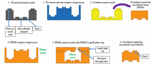 The negative impression of the original master mold is then cast using a tin-based silicone compound in a 10:1 ratio by weight of base to crosslinker. After the negative impression is cured and set, liquid plastic in a 1:1 ratio of components is poured into it, forming a rigid urethane master mold. Again, a negative impression of this new master mold is created using polydimethylsiloxane (PDMS) in a 10:1 weight ratio of base to crosslinker and set to cure. Following plasma and silane treatment, a PDMS version of the urethane master mold is cast using the PDMS negative impression casting. This step-by-step process can be visualized and followed in Figure 5. Micromilling or laser etching can then be used to engrave microchannels into the fabricated blocks [3].