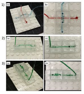 The fully assembled Lego structure can be used for several biological and chemical operations including filtration of molecules or cells into droplets, sorting them by size, mixing fluids into gradients for experimental purposes, or even mimicking microenvironments found in the body for in vivo studies [4]. Recent developments also allow for pollution monitoring, drug screening and testing, medical diagnostics, and chemical detections. The prefabricated pieces require nothing more than a simple assembly, eliminating the need for lithography procedures in clean-rooms [5].