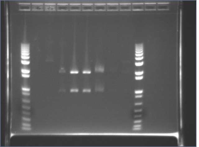 - Bands were almost invisible (wells used were those to the right of the second ladder). This may have been due to a second wash step during the mini-preps (although this is unlikely).