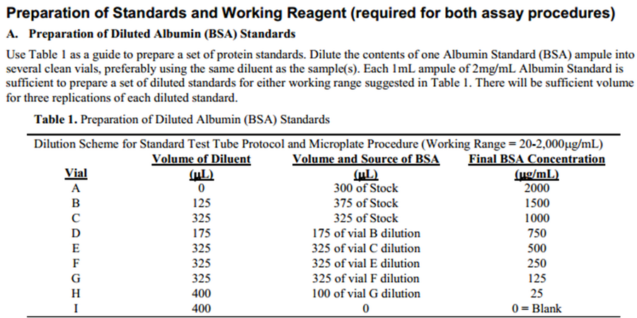 - Prepare Standards ( 2 fold dilutions): 2 µg/ µl, 1 µg/ µl, 0.5 µg/ µl, 0.25 µg/ µl, 0.125 µg/ µl