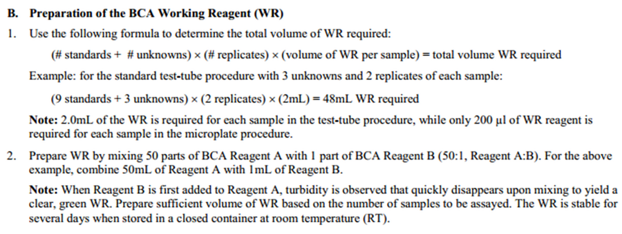 Prepare working reagent (WR) standards for Pierce kit - To prepare working solution mix 50 parts Reagent A with 1 part Reagent B (ie. 50 ml Reagent A plus 1 ml Reagent B)