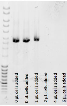 - This experiment shows that 2uL of [[Lidstrom:Autoinduction_Media|autoinduced culture] inhibits the ability of OneTaq 2X Quickload to produce DNA.