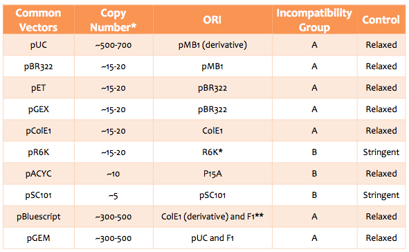 | pBR322 | ~ 20 to ~40 | pET (all) & pET duet, pTrcHis2(A,B,C) | ColE1 | ||