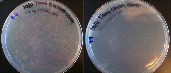 - Transformations done with 1uL of 0.1 ng/uL DNA (pGA 3K3 RFP from Rob Egbert). 0.1 ng is ~10^8 plasmid copies. Tami's electrocomp cells yielded several hundred colonies, which suggests the transformation efficiency is on the order of 100/10^8 = 0.000001 = 0.0001% efficiency. The chemically competent cells yielded < 10 colonies, which is much lower efficiency.