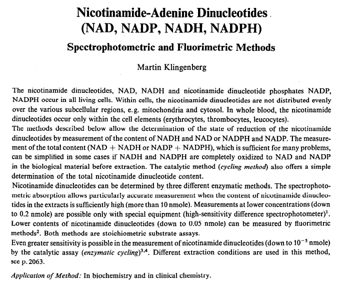 - NAD(P)+ absorbs strongly in the ultraviolet due to the adenine base. Peak absorption is at 259 nm, with an extinction coefficient of 16,900 M-1 cm-1 . The reduced forms of NAD(P)H also absorb at a higher wavelength, with a second peak in UV absorption at 339 nm that has an extinction coefficient of 6,220 M-1 cm-1 . This difference in the ultraviolet absorption spectrums between the oxidized and reduced forms of the coenzymes makes it simple to measure the conversion of one to another in enzyme assays by measuring the amount of UV absorption at 339 nm using a spectrophotometer. However, the UV method suffers from poor selectivity, high background and low sensitivity since many biological substances have strong absorption from 250 to 400 nm. It is quite troublesome to use the UV detection method to detect NAD/NADH and NADP/NADPH when they coexist with other biological molecules that have UV absorption from 250 to 400 nm. source