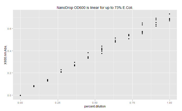 - NanoDrop OD600 readings are very linear up until a 73% E.Coli solution. Concentrations above that point seem to approach a convergence of OD600 values.