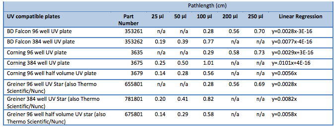 - This handy website gives approximate path lengths for several plate types with varying volumes: