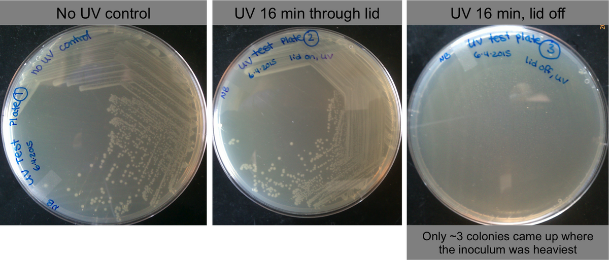 - 16 minutes of full UV exposure is pretty lethal. UV can not penetrate the plastic petri dish lids: