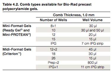 Maximum loading volumes for BioRad gels (source). As of 1/2014, the Lidstrom lab uses Mini-Format Gels with either 8 or 15 wells, so the maximum volumes are 30 or 15uL. Be careful not to let the samples splash into adjacent wells!