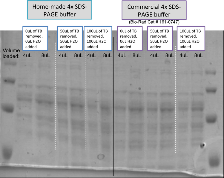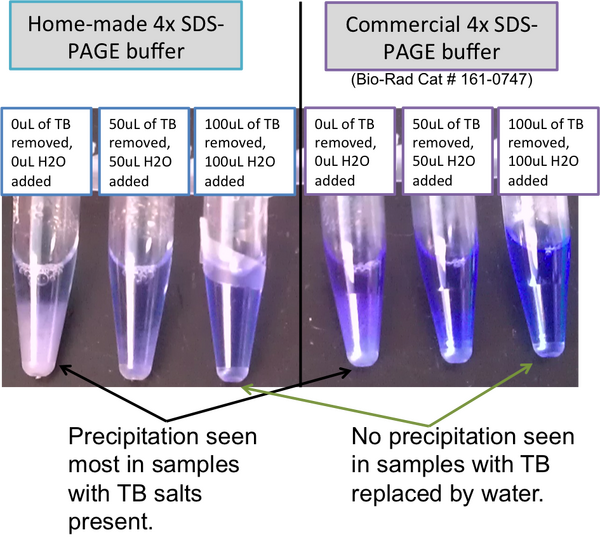 - If you are boiling cultures and adding total protein, you should know that TB buffer when mixed with loading dye and boiled results in a lot of white precipitate. You can leave the TB in the sample if you want because the precipitate doesn't matter in SDS-PAGE as the gel below shows.