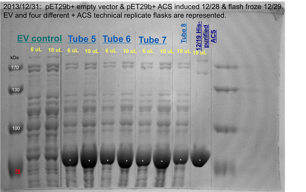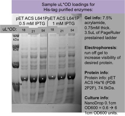 sample of loading different uL*OD amounts of total BL21(DE3 culture. Protein = His*6 tagged ACS 2P2F