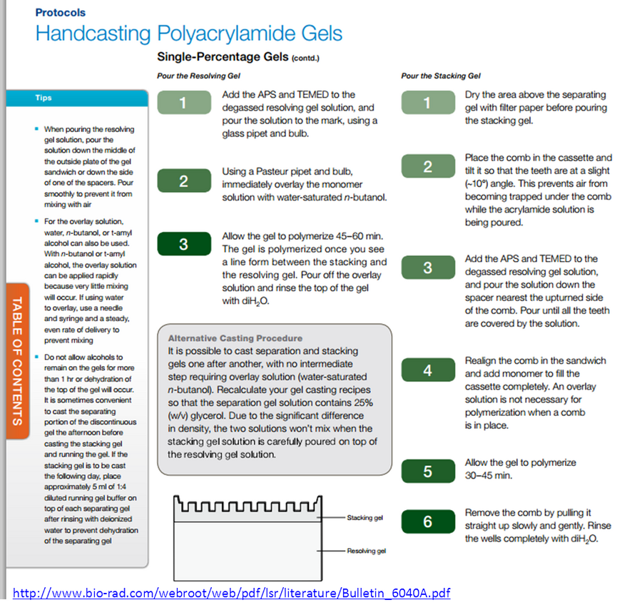 - note: commercial Tris gels have a shelf life of 6 months to 1 year. Amanda & Ceci don't keep hand-poured gels for more than a few (~4) weeks. (JM 11/2012)
