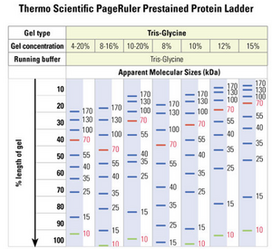 - Ladder (and all other protein samples) ran fine until 1/2 way through the gel, after which they nearly halted and stacked on top of one another. Immediately after, a ~1 cm wide band that spanned across the gel was visible as it refracted light differently. This band disappeared after a while of soaking, leading me to believe it was a buildup of one of the buffer compounds. When such a gel was soaked overnight in water and ladder was loaded in an unused adjacent well, and it ran perfectly without bunching up. This was a very repeatable phenomenon with all gels used before the problem was solved.