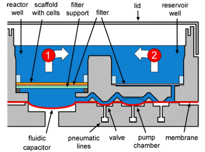 To accurately model the complexity of in vivo tissue using in vitro tissue models, devices and designs that have large scalability or high throughput are desirable. Dr. Griffith and colleagues developed an array of open well bioreactors with perfusion flow capabilities. The multiwell plate contains 12 individually isolated bioreactors that can grow between 400,00 and 600,000 cells. 3D tissue is cultured within the multiwell system by pipetting cell suspension directly onto ECM scaffolds present within each well. To ensure successful maintenance of the tissue, a transport model for oxygen was established to determine the effect of system parameters on oxygen concentrations gradients across each well. Conceptually, each bioreactor contains a reactor well, where the ECM scaffold and tissue is, a reservoir well to hold perfusion liquid, and a micropump to facilitate perfusion. The bioreactors of the multiwell array can be manually or automatically loaded with cell cultured and then individually sealed to reduce airborne contamination risks. The ECM scaffold itself contains 769 microchannels with a depth of 0.24 mm and 0.34 mm in diameter. A 5-micron pore filter under the scaffold captures cells within the channels. The inclusion of a filter in the reservoir prevents cells from clogging the perfusion micropumps. The tissue is perfused through the use of pneumatic micropump actuation, illustrated in Figure 4. This design for an array of microwell bioreactors successfully maintain 3D liver tissue with constant microperfusion. Predictive oxygen transport models for gradients through the bioreactor corresponded to quantitative data taken from experiments that measured the oxygen concentrations in rat hepatocytes cultures as a function of time and flow. LSECs, which struggle to maintain cell phenotype differentiation in static conditions, were proven maintain cell differentiation over two weeks due to the constant microperfusion. The benefits of this system include the scalability of the system, the controlled and stable oxygen gradients across the bioreactor, and the pneumatic pump system for vacuum-driven fluid flow.